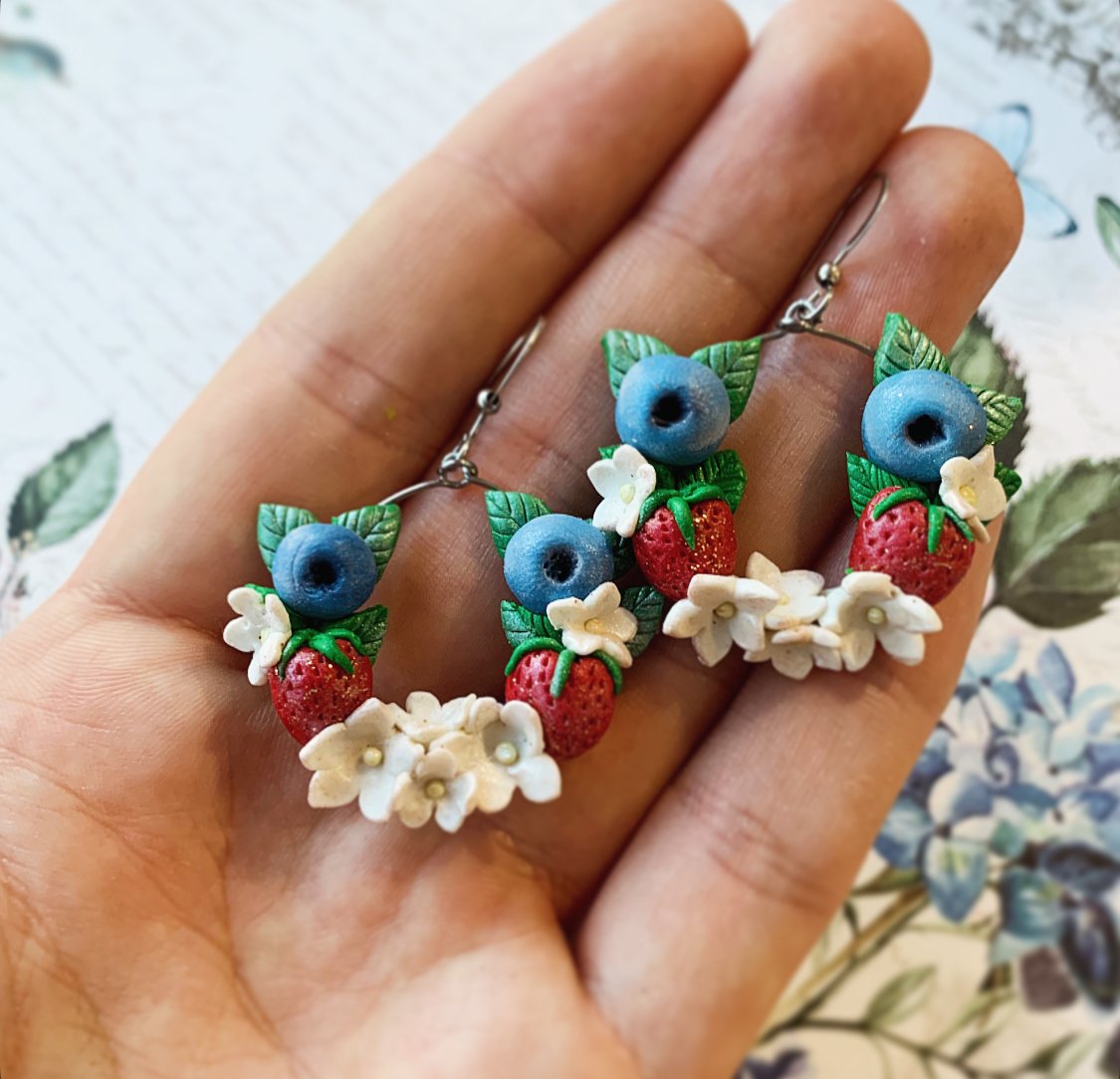 Fedezd fel a természet báját ezzel az egyedi és lenyűgöző lógós fülbevalóval, amely az erdei gyümölcsök inspirációját hozza el neked. A fülbevalón aprólékosan kidolgozott eprek, áfonyák, levelek és finom fehér virágok alkotnak egy harmonikus, koszorú formát. A részletek gondos kidolgozása és a természetes színek kombinációja garantálja, hogy ez a darab minden figyelmet magára vonz. Az orvosi fém akasztóval készült, így fémérzékenyek is bátran viselhetik.