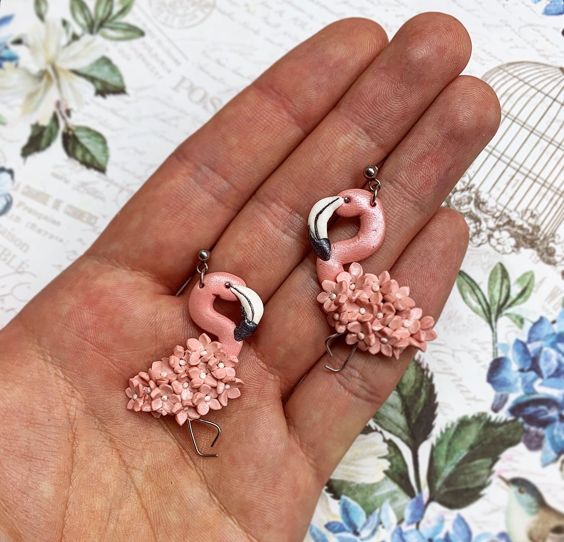 Engedd, hogy ez a gyönyörű flamingó fülbevaló a nyár és a trópusi hangulat megtestesítője legyen! A részletesen kidolgozott rózsaszín flamingókat apró, kézzel formázott virágok díszítik, amelyek még bájosabbá teszik őket. Az orvosi fém alap biztosítja, hogy fémérzékenyek is nyugodtan viselhessék.