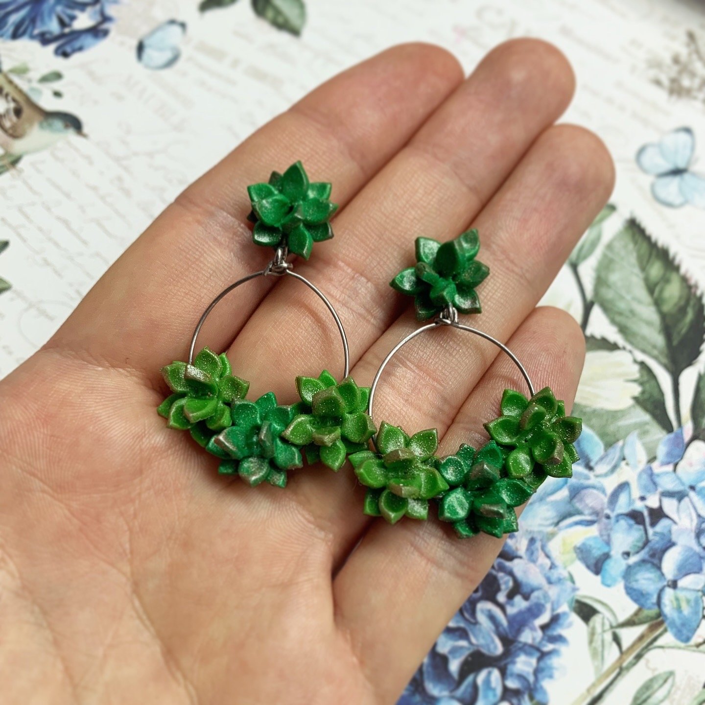 Természet ihlette kézműves fülbevaló, amely aprólékosan kidolgozott, zöld pozsgás növényeket tartalmaz. Elérhető dugattyús és kampós verzióban, hogy igazodjon a stílusodhoz.